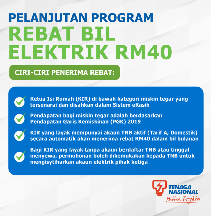 The RM40 Electric Bill Rebate Programme is a targeted government assistance program to finance monthly electricity bills of up to RM40 to those who are underprivileged and registered in the e-Kasih system. The program was announced by the Government in 2019 Budget Speech on 2nd November 2018.This RM40 Electric Bill Rebate Programme is a new programme introduced starting from 1 January 2019 to 31 December 2019. This programme replaces the RM20 Electric Bill Rebate Programme which ended in December 2018.